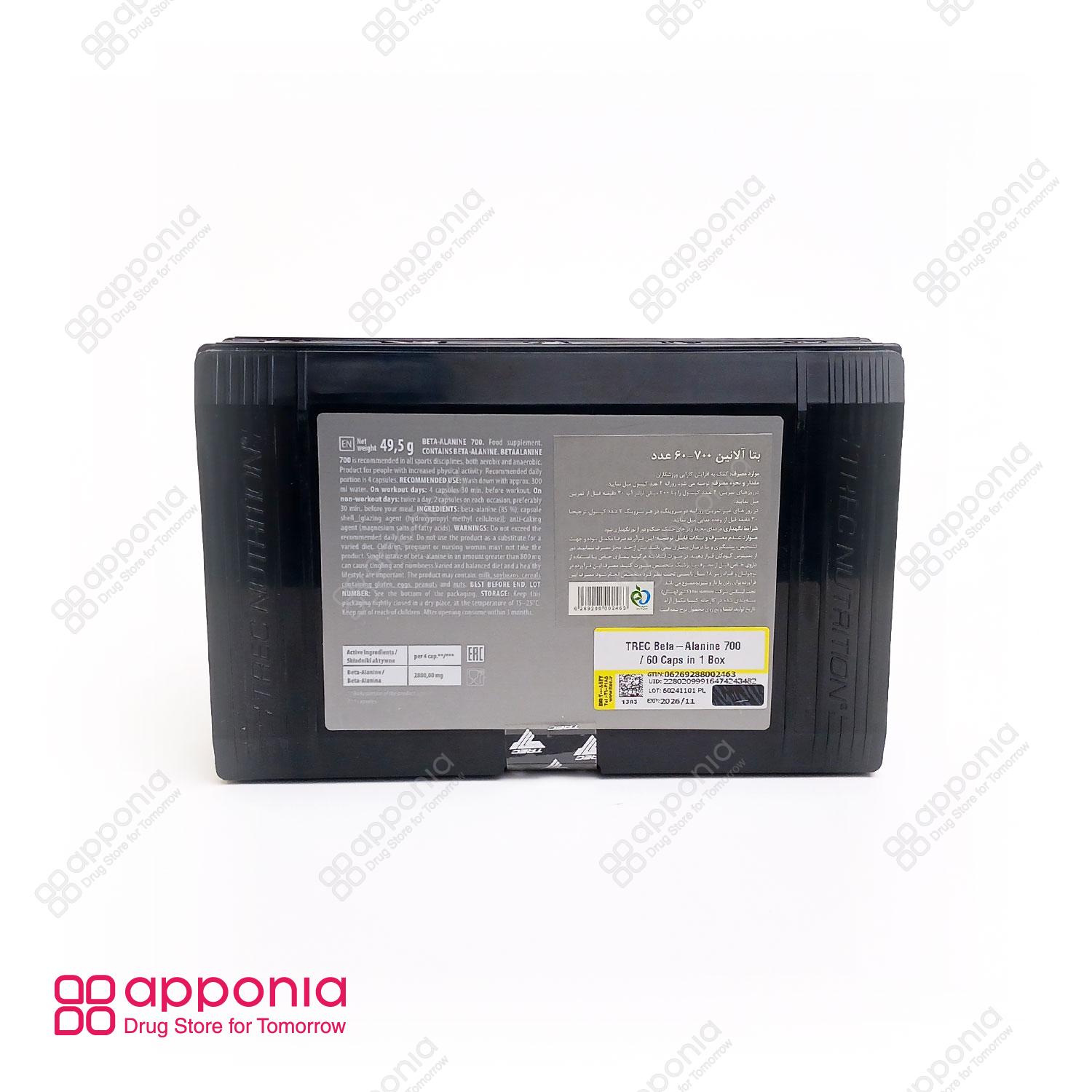 کپسول بتا آلانین ۷۰۰ ترک نوتریشن (Trec Nutrition Beta Alanine 700) یک مکمل ورزشی تخصصی است که برای ورزشکارانی طراحی شده که به دنبال بهبود استقامت و عملکرد در ورزشهای استقامتی و قدرتی هستند. این محصول حاوی آمینو اسید غیر ضروری بتا آلانین است و تحت لیسانس کشور لهستان تولید شده و توسط شرکت کیمیا مکمل آراد در ایران بستهبندی و عرضه میشود. این مکمل به صورت کپسول در محفظه پلاستیکی با تعداد ۶۰ عدد در هر بسته موجود است. هر کپسول حاوی ۷۰۰ میلیگرم بتا آلانین خالص است و دوز روزانه توصیه شده (۴ عدد کپسول) شامل ۲۸۰۰ میلیگرم بتا آلانین میباشد. مصرف این مکمل به بدنسازان و ورزشکاران کمک میکند تا به توان حداکثری عضلات دسترسی پیدا کرده و محدودیتهای عضلانی را پشت سر بگذارند.