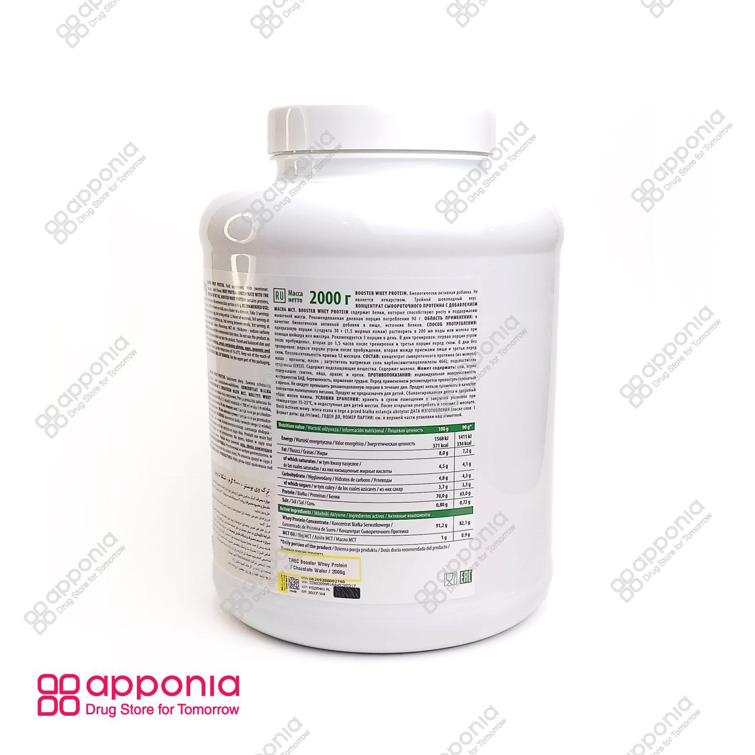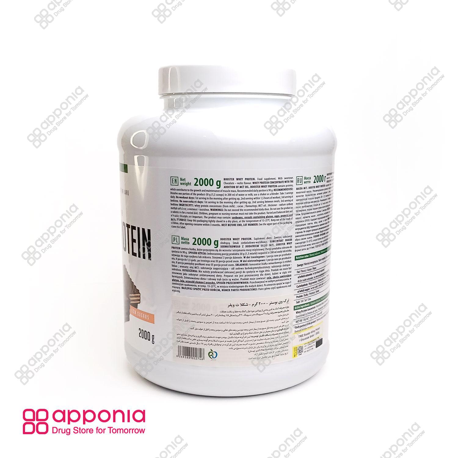 پودر پروتئین وی بوستر ترک نوتریشن (Trec Nutrition Booster Whey Protein) یک مکمل پروتئینی جدید است که تحت لیسانس شرکت ترک نوتریشن لهستان تولید شده و در داخل کشور توسط شرکت کیمیا مکمل آراد بستهبندی میگردد. این مکمل به صورت پودر طعمدار و در بستهبندیهای ۲ کیلوگرمی عرضه میشود و طعم آن شکلات ویفری است. بوستر وی با داشتن ۷۰ درصد پروتئین وی کنسانتره و تنها ۵ درصد کربوهیدرات، یکی از با ارزشترین مکملهای پروتئینی به شمار میآید. هدف اصلی این مکمل، کمک به عضلهسازی و رشد عضلات است، بدون آنکه باعث افزایش چربی در بدن ورزشکار شود، زیرا کمترین میزان کالری را در بین مکملهای پروتئینی دارا میباشد. هر پیمانه از این مکمل (حدود ۲۰ گرم) شامل ۱۴ گرم پروتئین وی کنسانتره، ۱ گرم کربوهیدرات و ۱.۵ گرم چربی کل است و ۷۴ کالری انرژی دارد. این محصول برای ورزشکاران حرفهای و افرادی که در حال افزایش حجم عضلانی هستند، طراحی شده است.