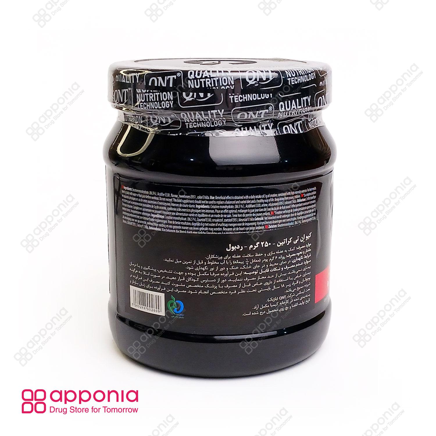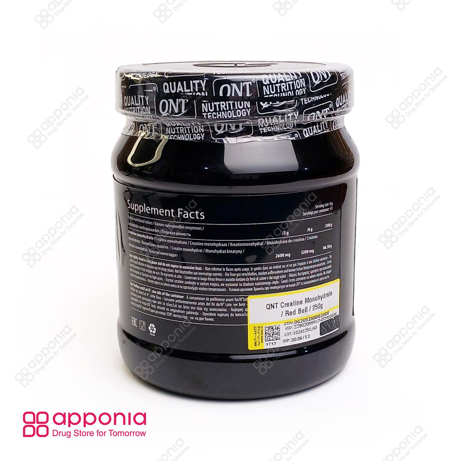 پودر کراتین مونوهیدرات کیو ان تی با طعم رد بول (QNT Creatine Monohydrate Red Bull) یک مکمل بدنسازی محبوب و پرمصرف است که حاوی کراتین مونوهیدرات بسیار با کیفیت میباشد. این محصول بهطور خاص برای کسانی طراحی شده که به انرژی و توانایی بالا برای انجام برنامههای ورزشی نیاز دارند. کراتین طعمدار کیو ان تی با طعم جذاب رد بول عرضه شده است و مصرف آن را برای ورزشکارانی که مایلند کراتین را به صورت طعمدار استفاده کنند، بسیار بهبود بخشیده است. این مکمل در قوطیهای ۲۵۰ گرمی به شکل پودر موجود است. پودر کراتین مونوهیدرات کیو ان تی تحت لیسانس شرکت کیو ان تی بلژیک است و توسط شرکت کیمیا مکمل آراد در ایران بستهبندی و تولید میشود. این مکمل در دوران دوره حجم نیز مورد استفاده قرار میگیرد.
