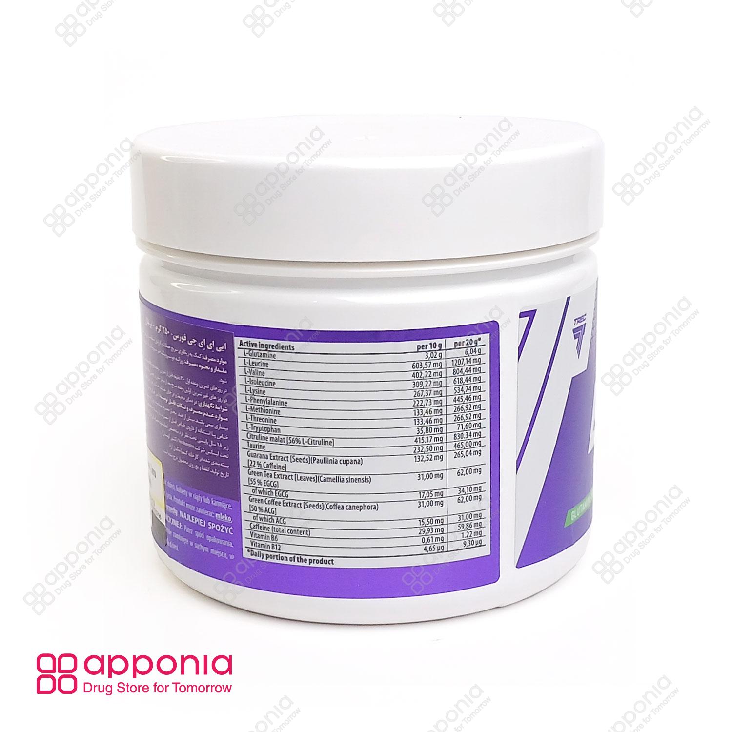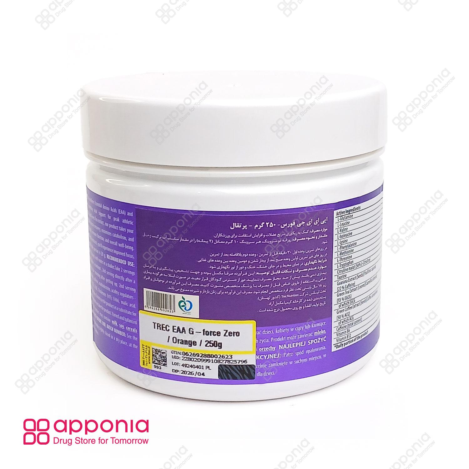 پودر ای ای ای جی فورس زیرو ترک نوتریشن (Trec Nutrition EAA G Force Zero Powder) یک مکمل ورزشی حرفهای و پیشرفته است که شامل تمامی آمینو اسیدهای ضروری (EAA) مورد نیاز بدن است که بدن قادر به تولید آنها نیست. این مکمل برای ورزشکاران حرفهای و آماتور با هدف افزایش قدرت، حجم عضلانی، و کاهش خستگی طراحی شده است. فرمولاسیون این محصول شامل آمینو اسیدهای ضروری و همچنین ترکیبات موثری مانند گلوتامین (۳.۰۲ گرم در هر ۱۰ گرم)، BCAA (شامل لوسین، والین و ایزولوسین)، سیترولین مالات (۴۱۵.۱۷ میلیگرم)، تائورین (۲۳۲.۵ میلیگرم) و ویتامینهای B6 و B12 به همراه عصارههای گیاهی است. این مکمل به صورت پودر طعمدار (مانند طعم پرتقالی) و در وزن ۲۵۰ گرم عرضه میشود. ایی دبل ای جی فورس زیرو ترک نوتریشن تحت لیسانس لهستان تولید شده و توسط شرکت کیمیا مکمل آراد در ایران بستهبندی و عرضه میشود.