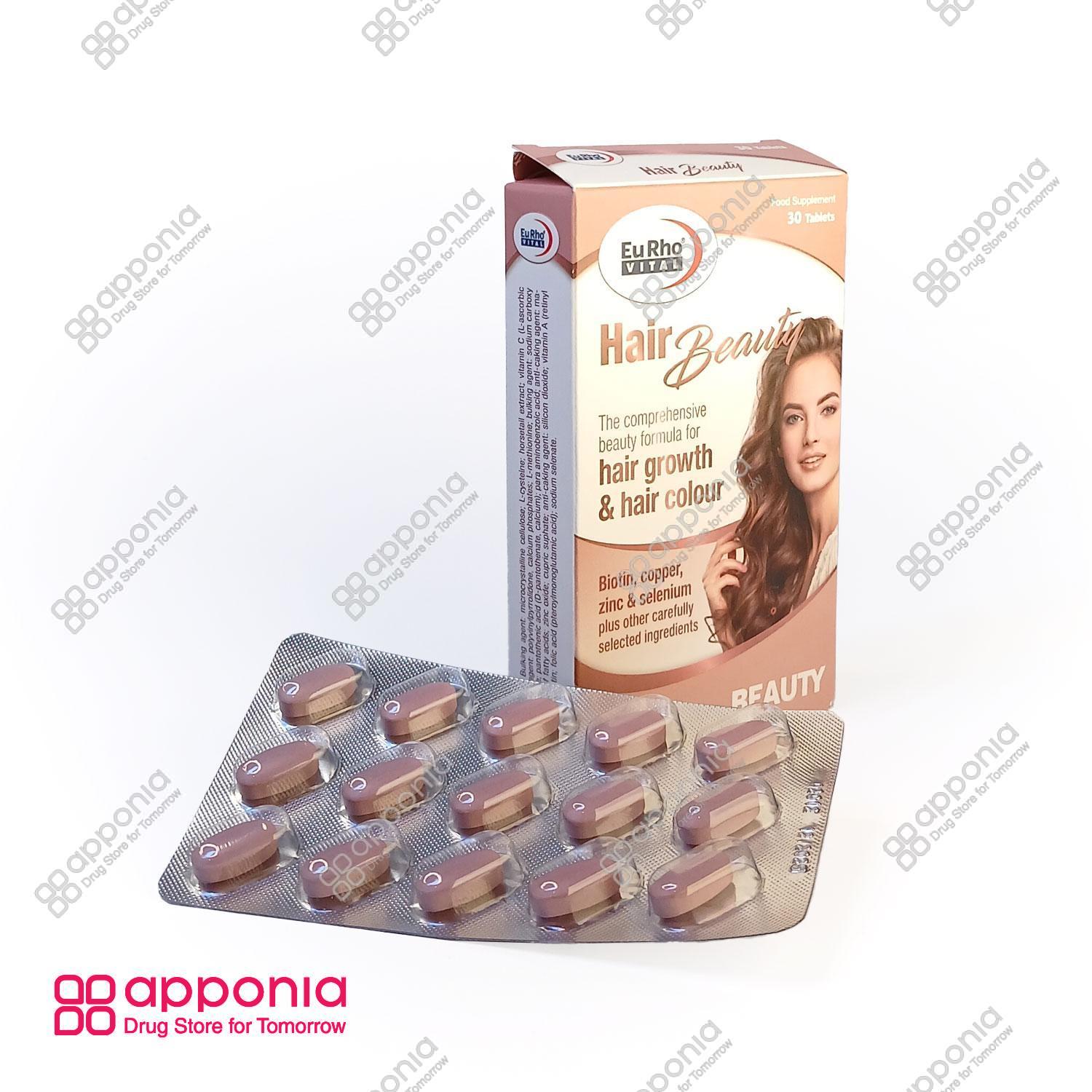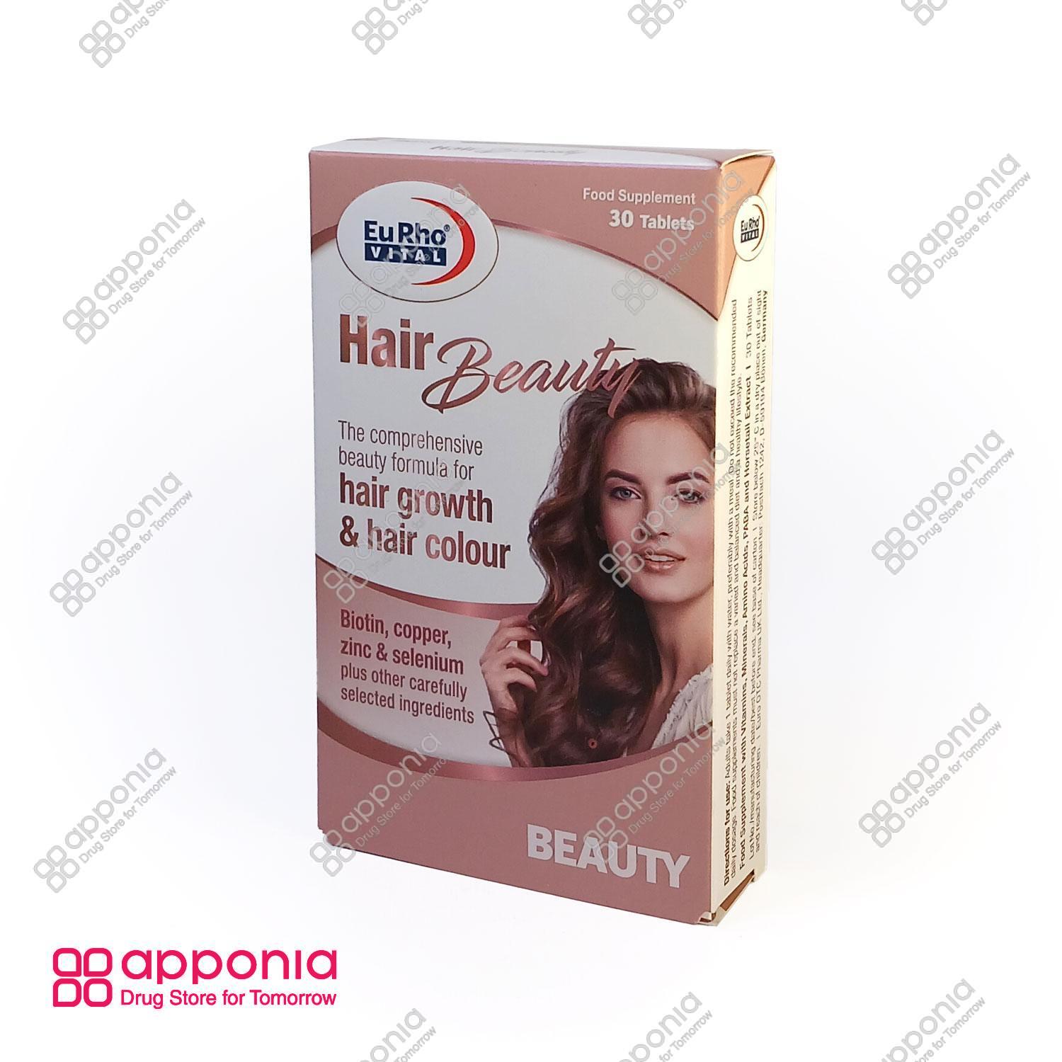 مجموعهای از آمینو اسیدهای سولفور دار، ویتامینها و مواد معدنی جهت رشد مو، تقویت ناخن و حفظ سلامت پوست ضروری است. کمبود این ریز مغذیها باعث آسیب، ریزش و تغییر در بافت و رنگ مو میشود. قرص هیر بیوتی یوروویتال حاوی آمینو اسیدهای ال- سیستئین و ال- متیونین، عصاره گیاه دم اسبی، پابا، ویتامینها و مواد معدنی مورد نیاز برای تقویت مو است.