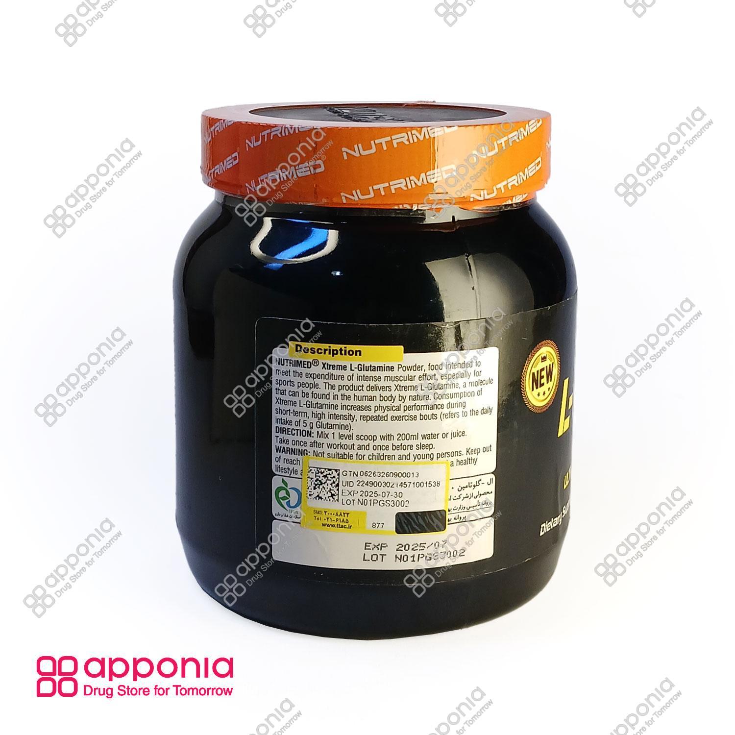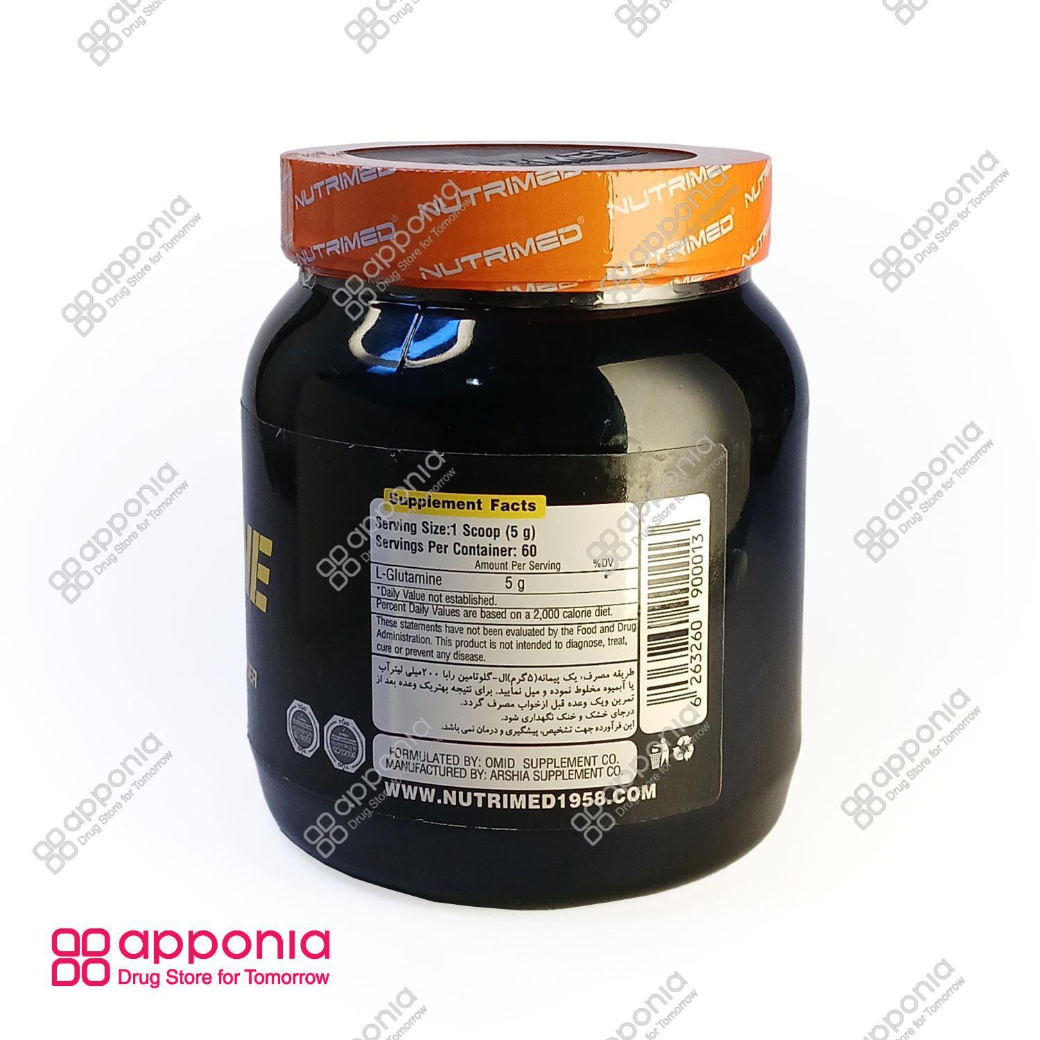 پودر ال گلوتامین نوتریمد (Nutrimed L-Glutamine Powder) در وزنهای مختلفی از جمله 300 گرم، 600 گرم و 1 کیلوگرم عرضه میشود. این محصول توسط شرکت امید مکمل سلامت در ایران و تحت برند نوتریمد تولید میگردد. گلوتامین شایعترین اسید آمینه موجود در عضلات است و بیش از ۶۱٪ از عضلات اسکلتی را تشکیل میدهد. این اسید آمینه ۱۹٪ نیتروژن دارد و اولین حمل کننده نیتروژن به سلولهای عضلانی است.