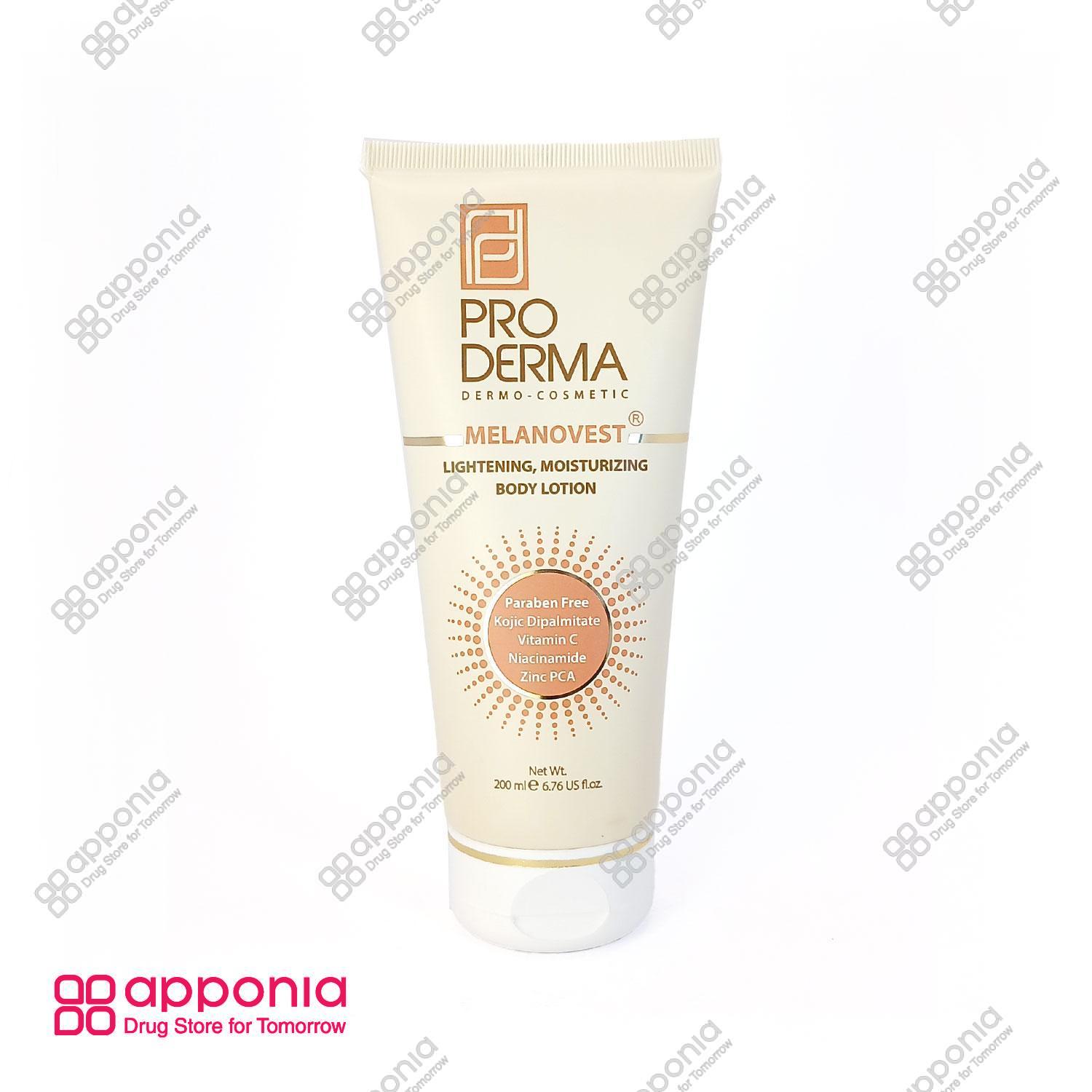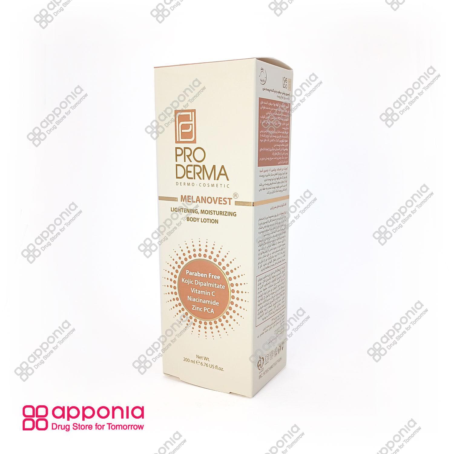 لوسیون بدن روشن کننده ملانووست پرودرما (Pro Derma Melanovest Lightening & Brightening Body Lotin) محصولی ۲۰۰ میلیلیتری است که به منظور روشن کردن و رفع تیرگی و کدری پوست بدن طراحی شده است. این لوسیون علاوه بر خاصیت روشنکنندگی، مرطوبکننده و آبرسان عمقی پوست نیز میباشد و به کاهش لکهای تیره و ناهنجاریهای رنگی کمک میکند. یکی از ویژگیهای مهم آن، فاقد بودن پارابن و مواد شیمیایی مضر است که استفاده از آن را برای انواع پوست مناسب میسازد. این محصول ساخت ایران توسط شرکت آراشیمی پارس میباشد.