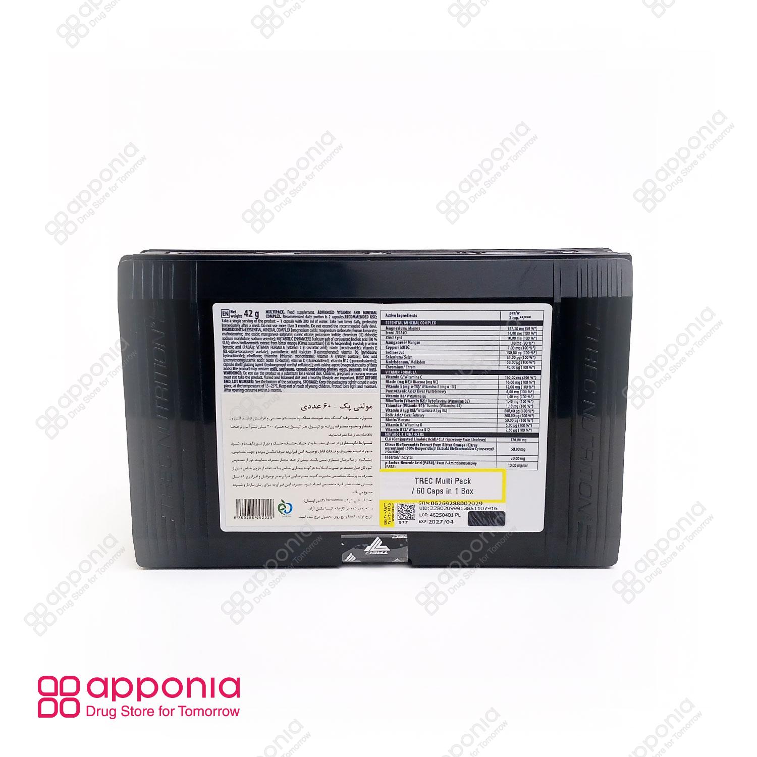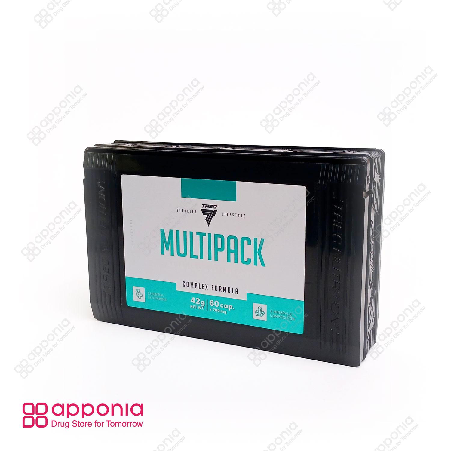 پودر (کپسول) مولتی پک ترک نوتریشن (Trec Nutrition Multi Pack) یک مکمل غذایی جامع و پیشرفته است که به منظور تأمین نیازهای ویتامینی و مواد معدنی بدن افراد، بهویژه ورزشکاران، طراحی شده است. این مکمل شامل طیف کاملی از انواع مواد معدنی، ویتامینها و عوامل افزایشدهنده متابولیسم بدن است. مولتی پک ترک نوتریشن حاوی ویتامینهای ضروری بدن مانند ویتامینهای گروه B (که برای تولید صحیح انرژی و تقویت عملکرد سیستم عصبی ضروری هستند)، ویتامین C (که از سلولها در برابر استرس اکسیداتیو محافظت میکند و عملکرد سیستم ایمنی را در فعالیتهای فیزیکی شدید بهبود میبخشد)، ویتامین A، ویتامین E و فولیک اسید میباشد. همچنین، این محصول حاوی مواد معدنی لازم برای تقویت سیستم ایمنی، مانند سلنیوم و زینک (روی)، و همچنین کروم، آهن، ید و مس و منیزیم است. منیزیم موجود در این مکمل به عملکرد طبیعی سیستم عصبی کمک کرده و در کاهش خستگی و کوفتگی مؤثر است. این محصول به صورت کپسول و در بستهبندیهای ۶۰ عددی عرضه میشود. مولتی پک تحت لیسانس شرکت ترک نوتریشن لهستان است (البته در یکی از منابع به مجارستان نیز اشاره شده) و در کارخانه کیمیا مکمل آراد در ایران بستهبندی میگردد.