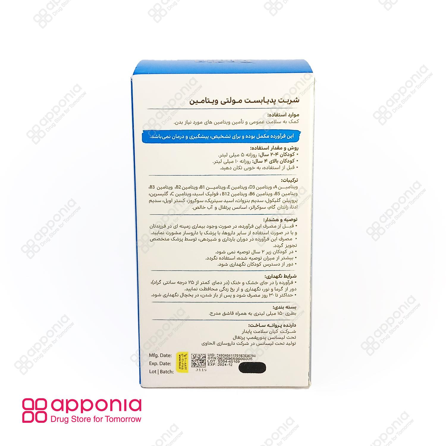 شربت مولتی ویتامین پدیابست (Pedia Best Multivitamin Syrup) یک مکمل مولتی ویتامین تخصصی است که برای کودکان بیش از ۲ سال طراحی و تولید شده است. این شربت در حجم ۱۵۰ میلیلیتر و با طعم پرتقال عرضه میگردد تا پذیرش آن برای کودکان راحتتر باشد. این محصول تحت لیسانس برند پدیابست (Pediabest) پرتغال است، اما تولید آن در ایران و توسط شرکت الحاوی انجام میشود. شربت مولتی ویتامین پدیابست حاوی ۱۱ ویتامین ضروری و مورد نیاز بدن کودکان است. ترکیبات اصلی آن شامل ویتامینهای A (۱۰۰۰ واحد بینالمللی در هر ۵ میلیلیتر)، D3 (۶۰۰ واحد بینالمللی)، E، C (۲۵ میلیگرم)، اسید فولیک (۲۰۰ میکروگرم) و تمام ویتامینهای گروه B (شامل B1, B2, B3, B5, B6, B12) میباشد. این فرآورده به منظور تأمین ترکیبات مغذی برای کودکانی که رژیم غذایی مناسبی ندارند یا از کمغذایی رنج میبرند، فرموله شده است.