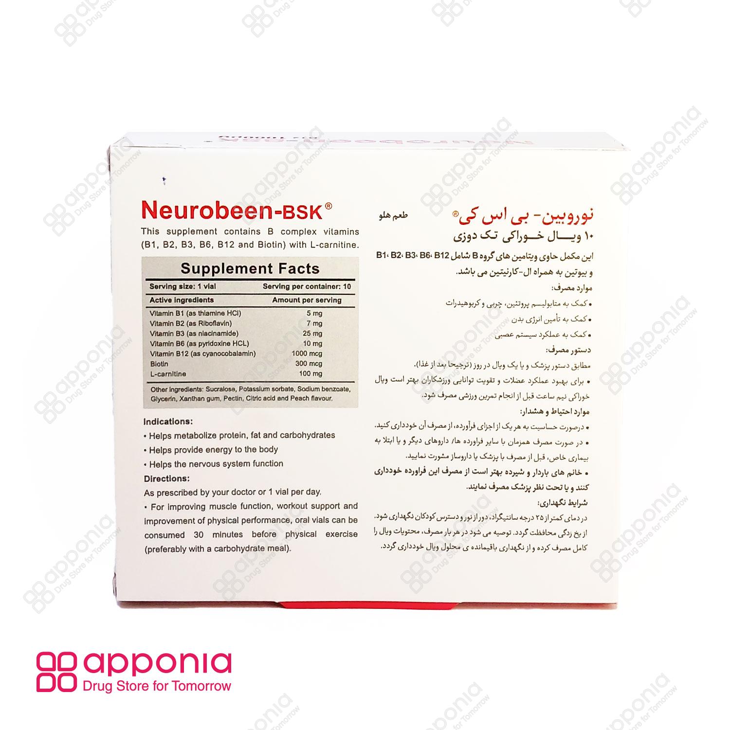 ویال خوراکی نوروبین بیاسکی (Neurobeen BSK) اولین فرآورده بکمپلکس به شکل ویال تکدوز مایع خوراکی با طعم هلو است که توسط شرکت بنیان سلامت کسری در ایران تولید میشود . این مکمل به دلیل فرم مایع، دارای جذب و اثرگذاری سریع بوده و به عنوان یک جایگزین مناسب و در دسترس برای آمپولهای تزریقی نوروبیون شناخته میشود. ترکیبات این محصول فاقد گلوتن و قند است، بنابراین برای طیف وسیعی از افراد جهت افزایش متابولیسم و تأمین انرژی روزانه مناسب میباشد. هر ویال ۱۰ میلیلیتری حاوی دوز بالایی از ویتامین B12 (۱۰۰۰ میکروگرم) به همراه الکارنیتین، بیوتین و سایر ویتامینهای گروه B (B1, B2, B3, B6) است که نقشی حیاتی در سوختوساز سلولی و عملکرد صحیح سیستم عصبی ایفا میکنند.
