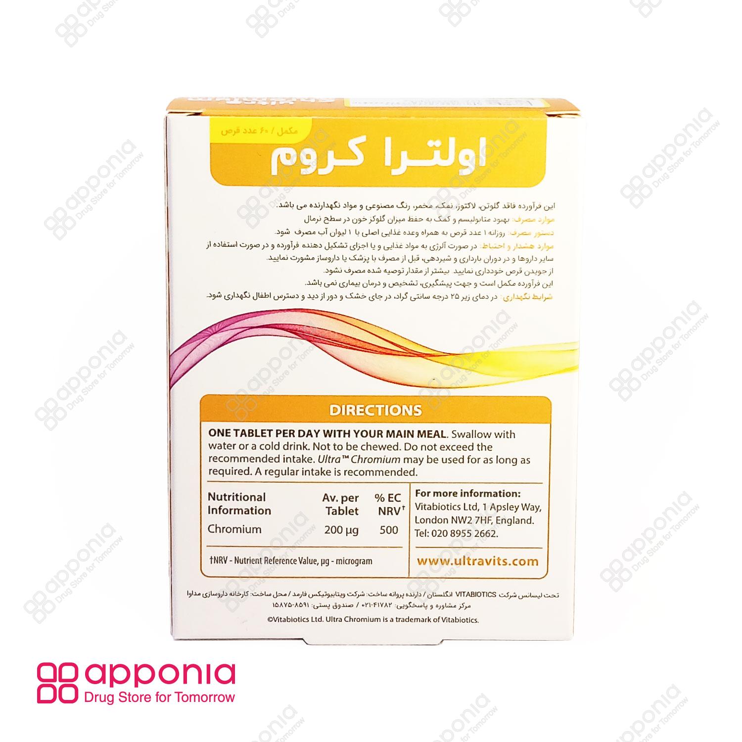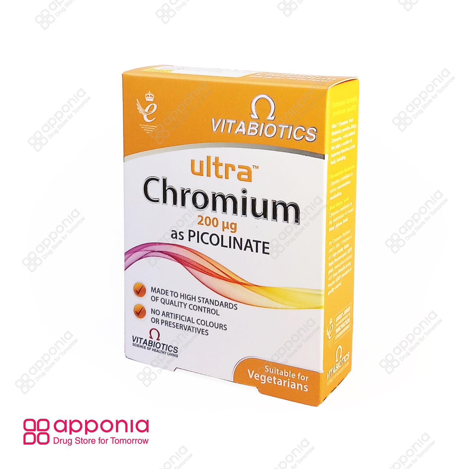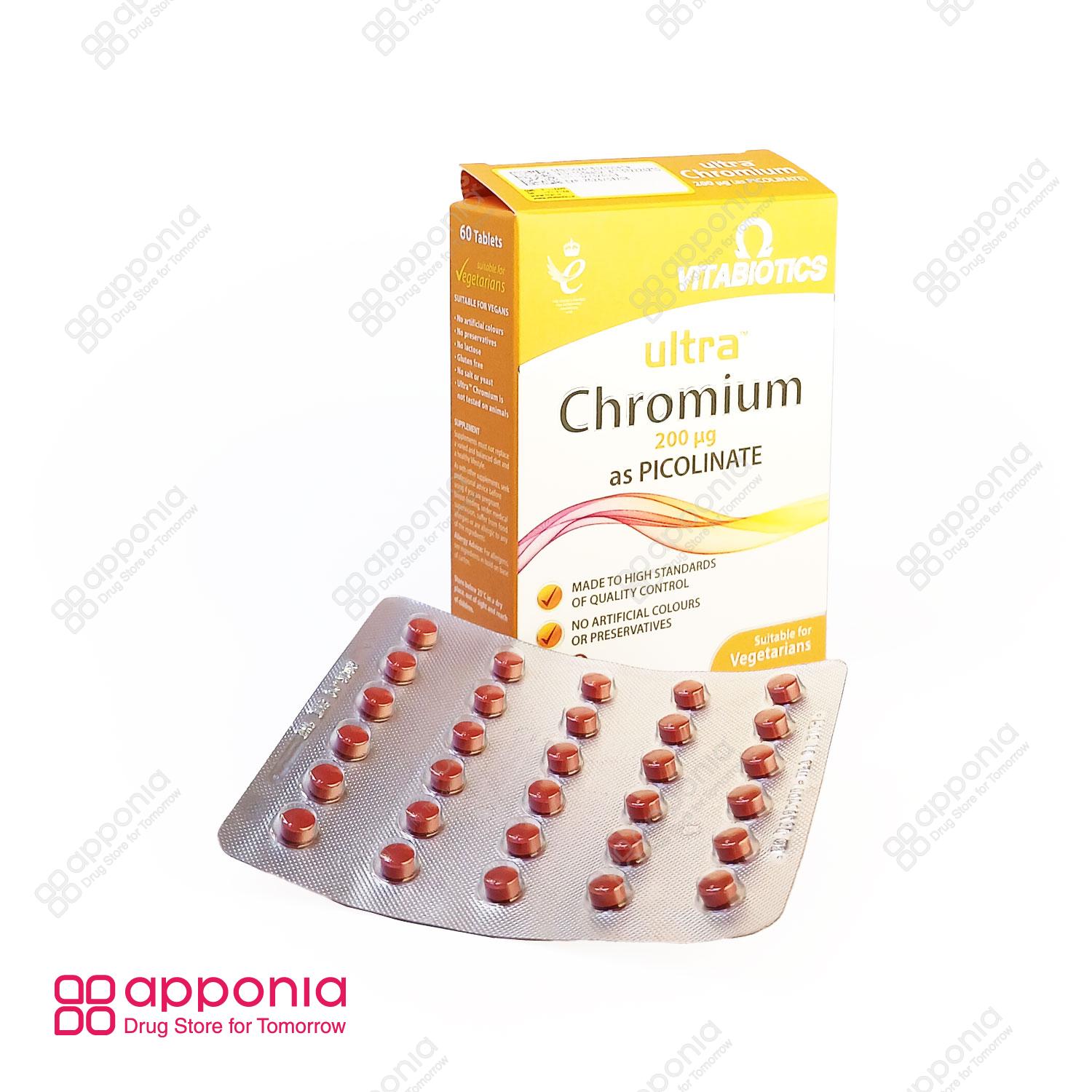 قرص اولترا کروم ویتابیوتیکس یک مکمل تخصصی و حاوی ۲۰۰ میکروگرم عنصر کمیاب کروم است که نقش حیاتی در تنظیم متابولیسم بدن ایفا میکند. این فرآورده با تقویت عملکرد انسولین، به انتقال قند از جریان خون به سلولها کمک کرده تا در آنجا به انرژی تبدیل شود؛ این فرآیند مانع از نوسانات شدید قند خون و تمایل بیش از حد به مصرف شیرینیجات میگردد. محصول مذکور تحت لیسانس ویتابیوتیکس انگلستان تولید شده و فاقد هرگونه مواد نگهدارنده، رنگ مصنوعی، گلوتن، لاکتوز و مخمر است، به همین دلیل برای گیاهخواران نیز کاملاً مناسب میباشد.